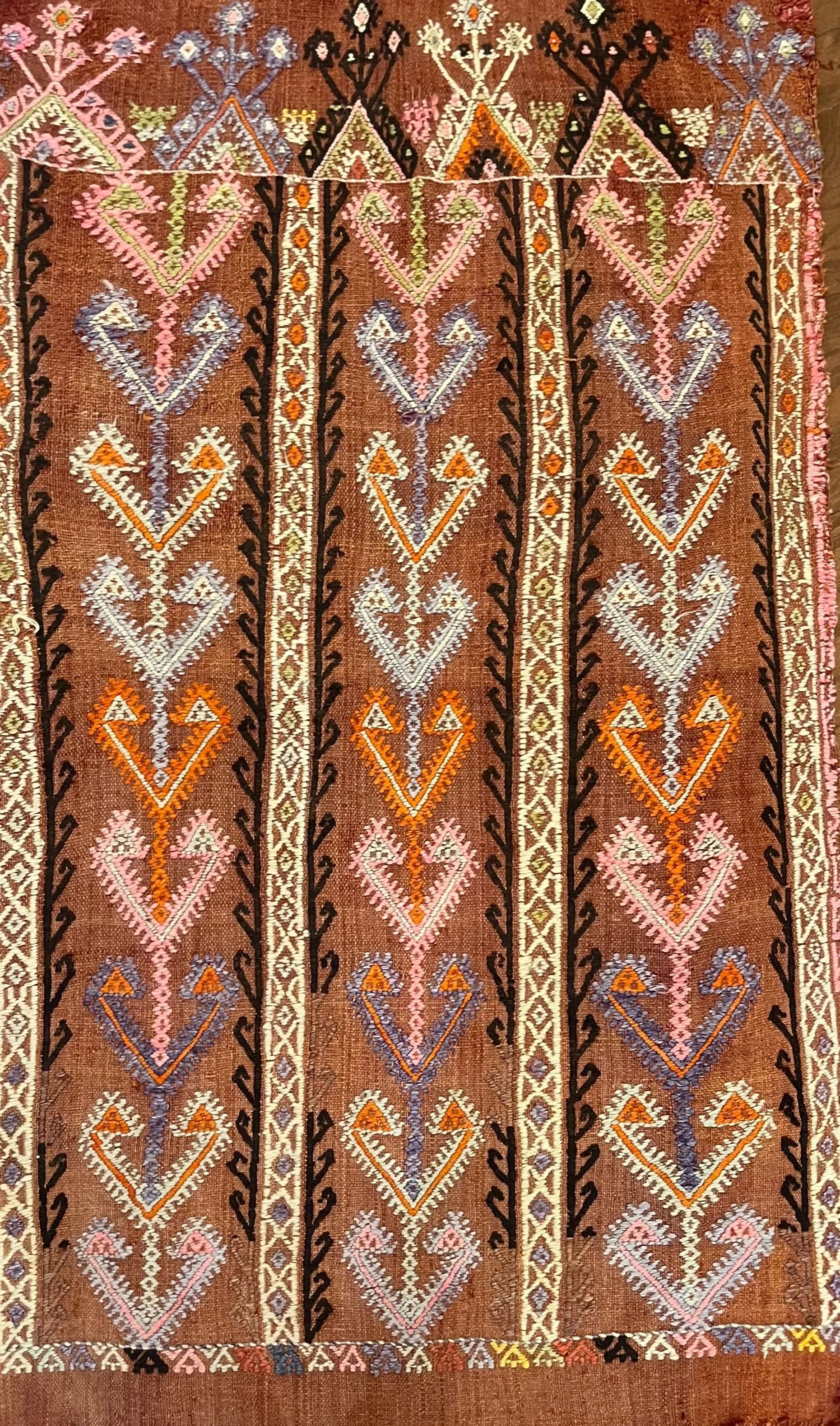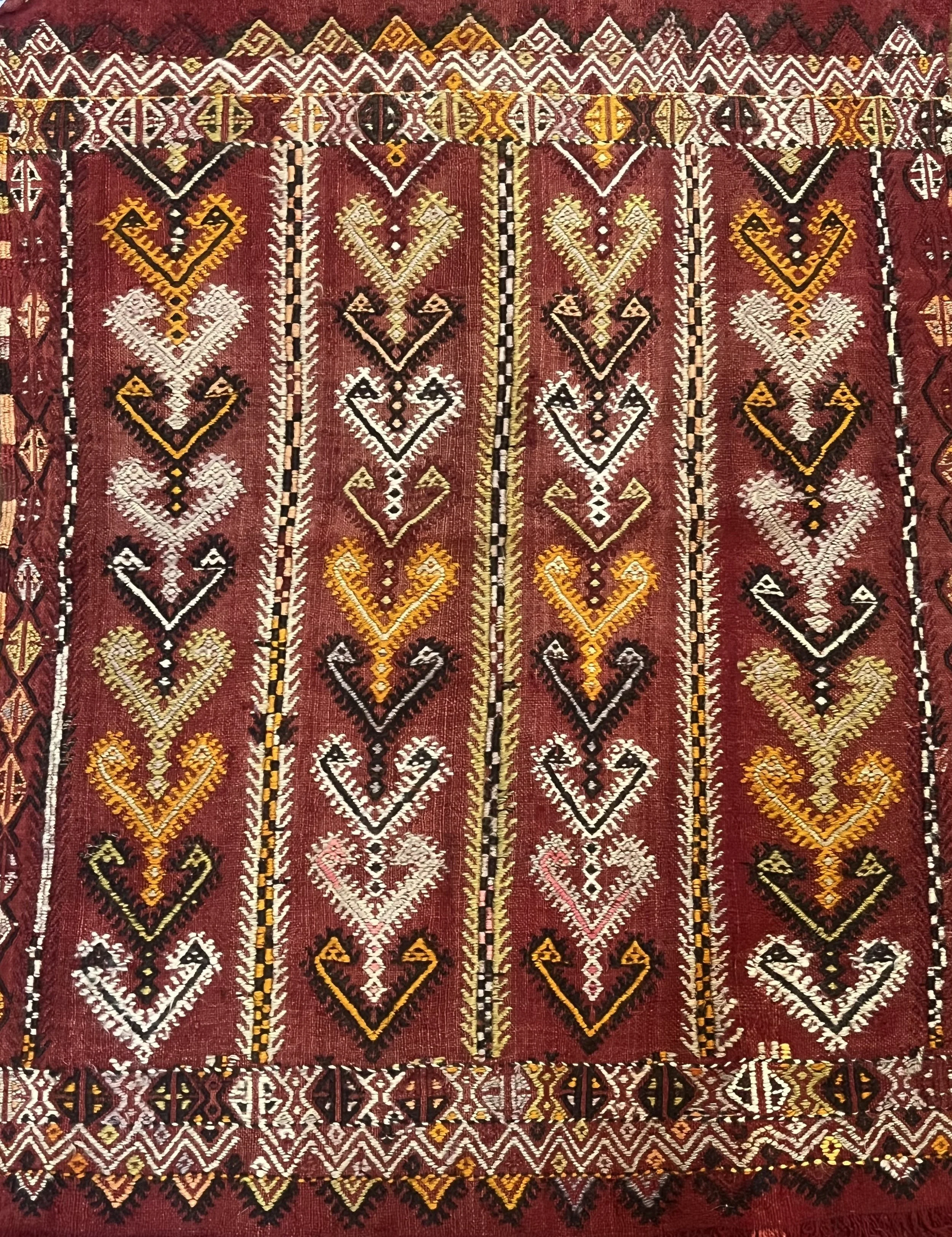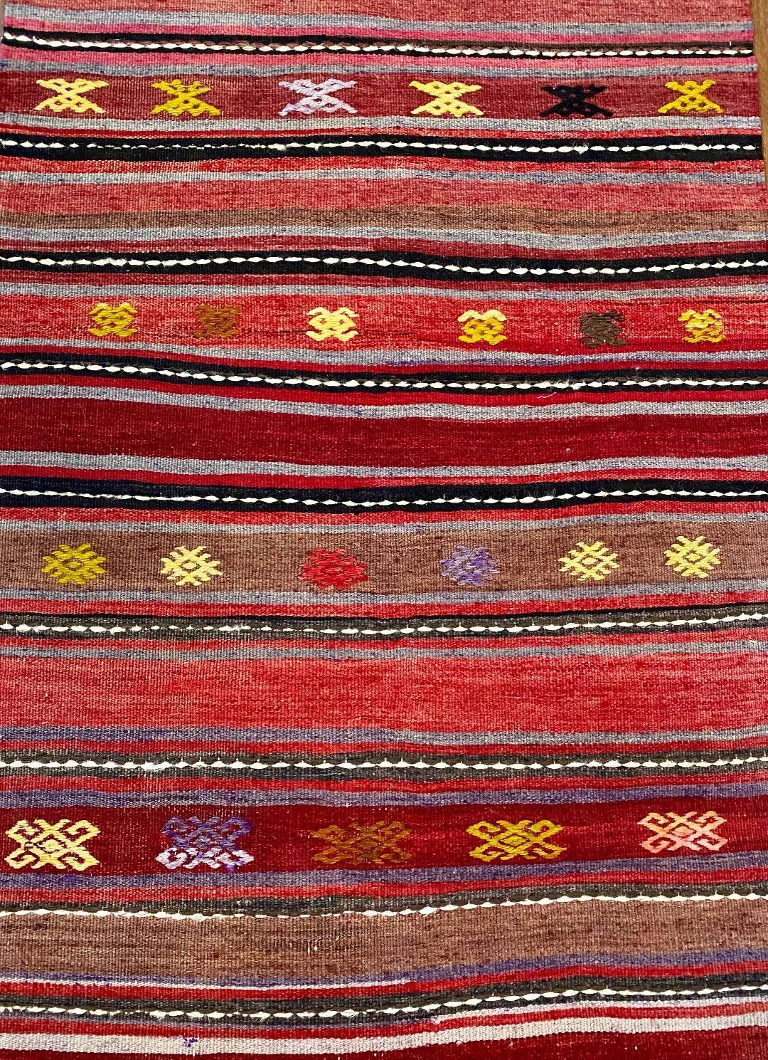 A handmade flat-woven textile composed of colorful natural fibers. Jajims are tribal and woven in rural areas. These were made in narrow strips and were traditionally used for table covers, bed covers, tents and ceremonial panels. Jajims are collectible as small pieces of textile art, often made into pillows or wall hangings.