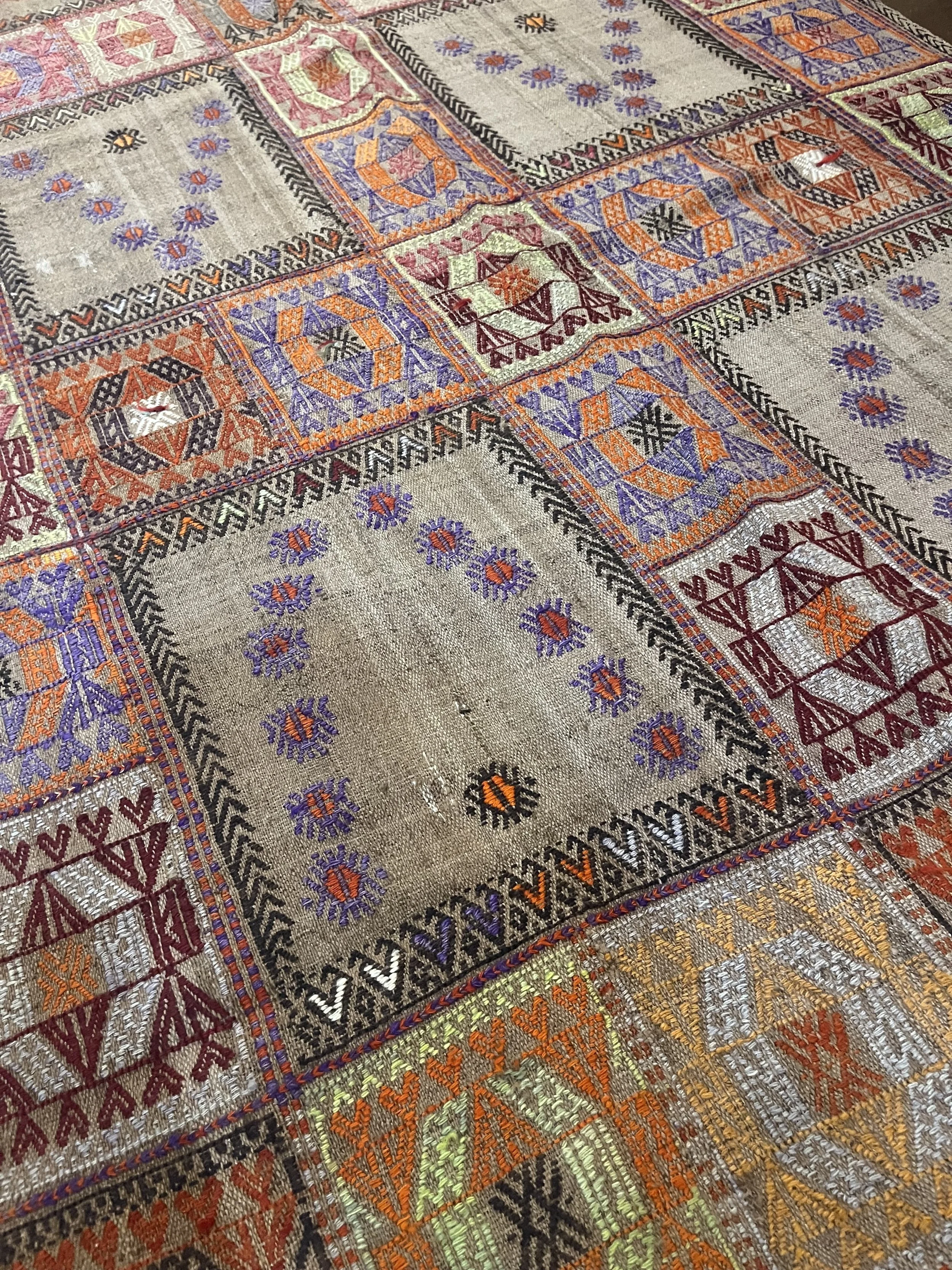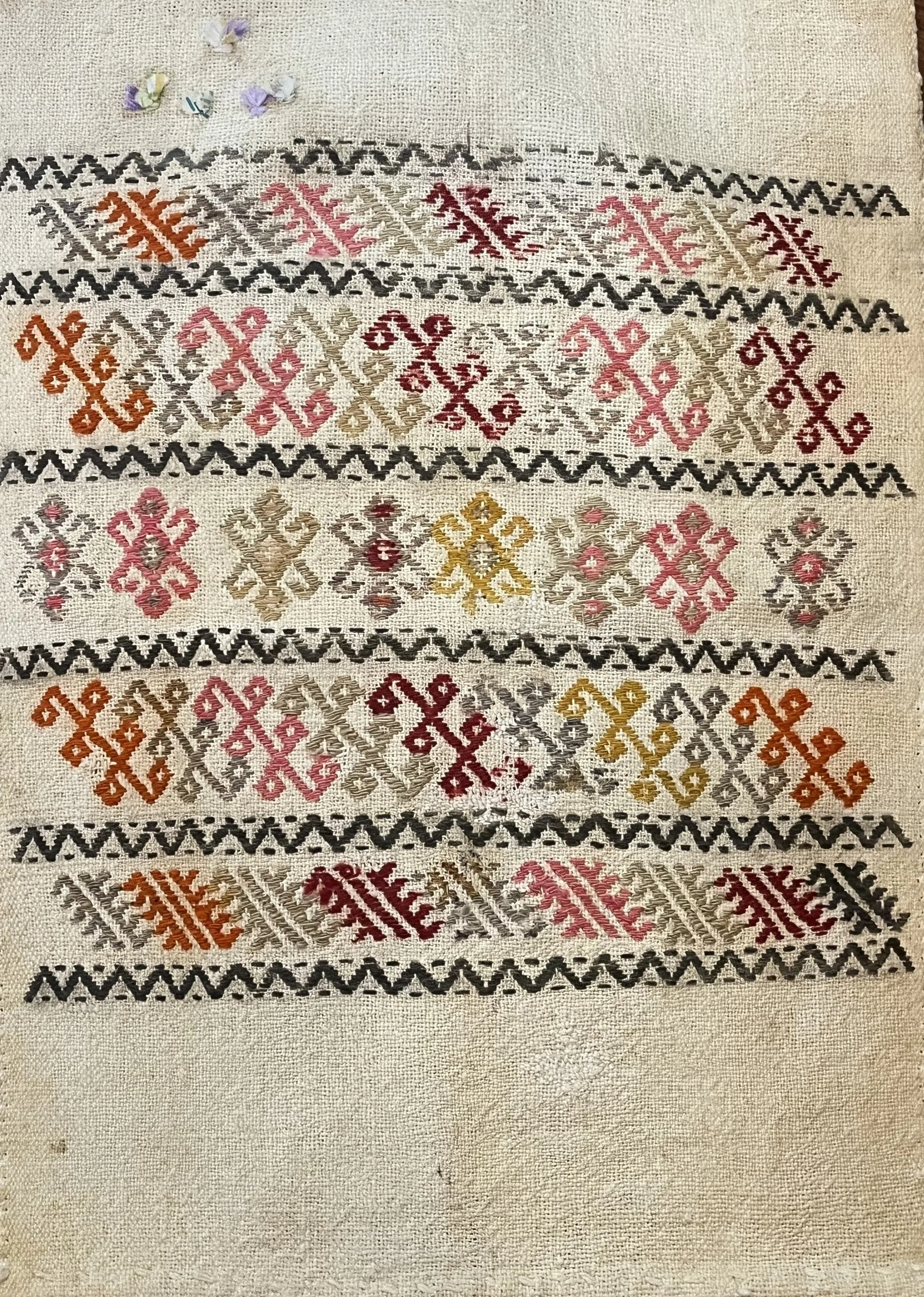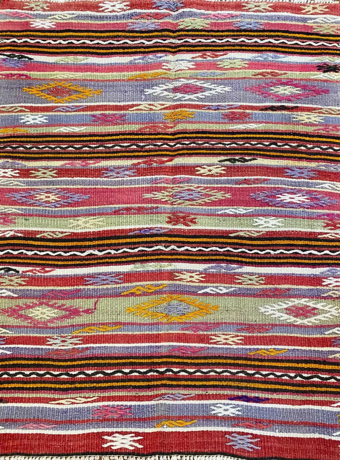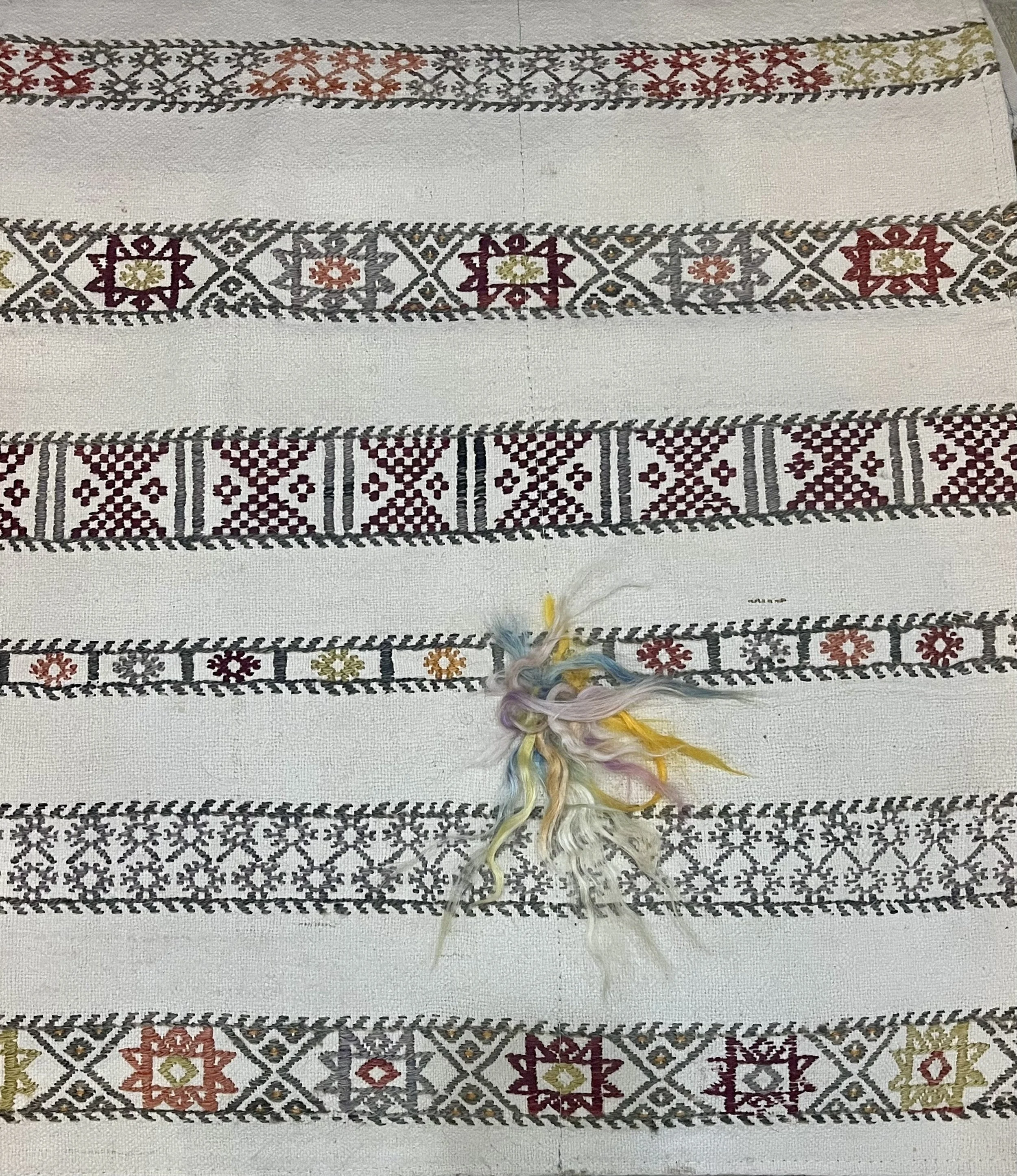 A handmade flat-woven textile composed of colorful natural fibers. Jajims are tribal and woven in rural areas. These were made in narrow strips and were traditionally used for table covers, bed covers, tents and ceremonial panels. Jajims are collectible as small pieces of textile art, often made into pillows or wall hangings.